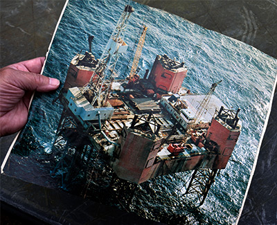 Et billede fra et af mine tidligere besøg ved Nordsøens oliefelter. En borerig. Billedet blev bragt på to sider i Billed-Bladet. Billedet er taget stående i helikopterens åbne dør. Mens jeg hold fast i dørkarmen med venstre hånd - og havde kameraet i den anden. Her, mange år efter, kan det godt give et gys i mig. Men alt for et godt billede, sådan var det. Piloten havde heldigvis en rolig hånd. Foto: John Stæhr/Scanpix